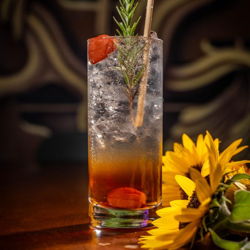 A plum gin fizz with house-infused rosemary syrup, Angostura bitters, seltzer, and a splash of butterfly pea infusion; in honor of our first year of business.